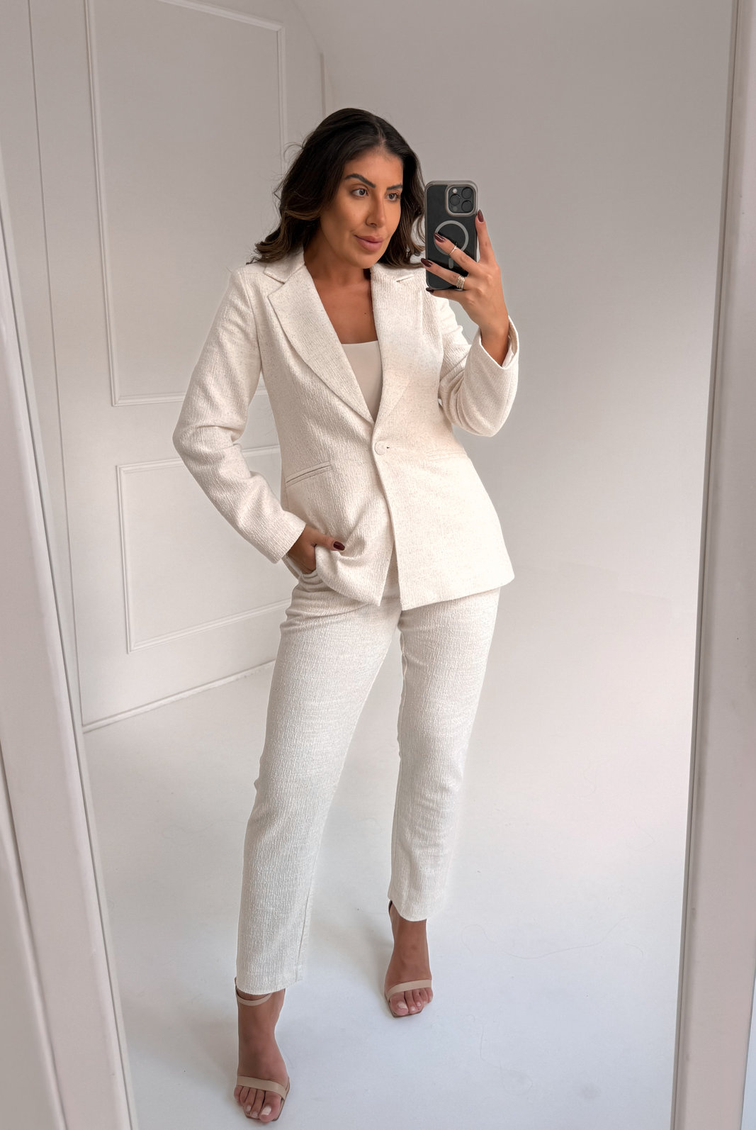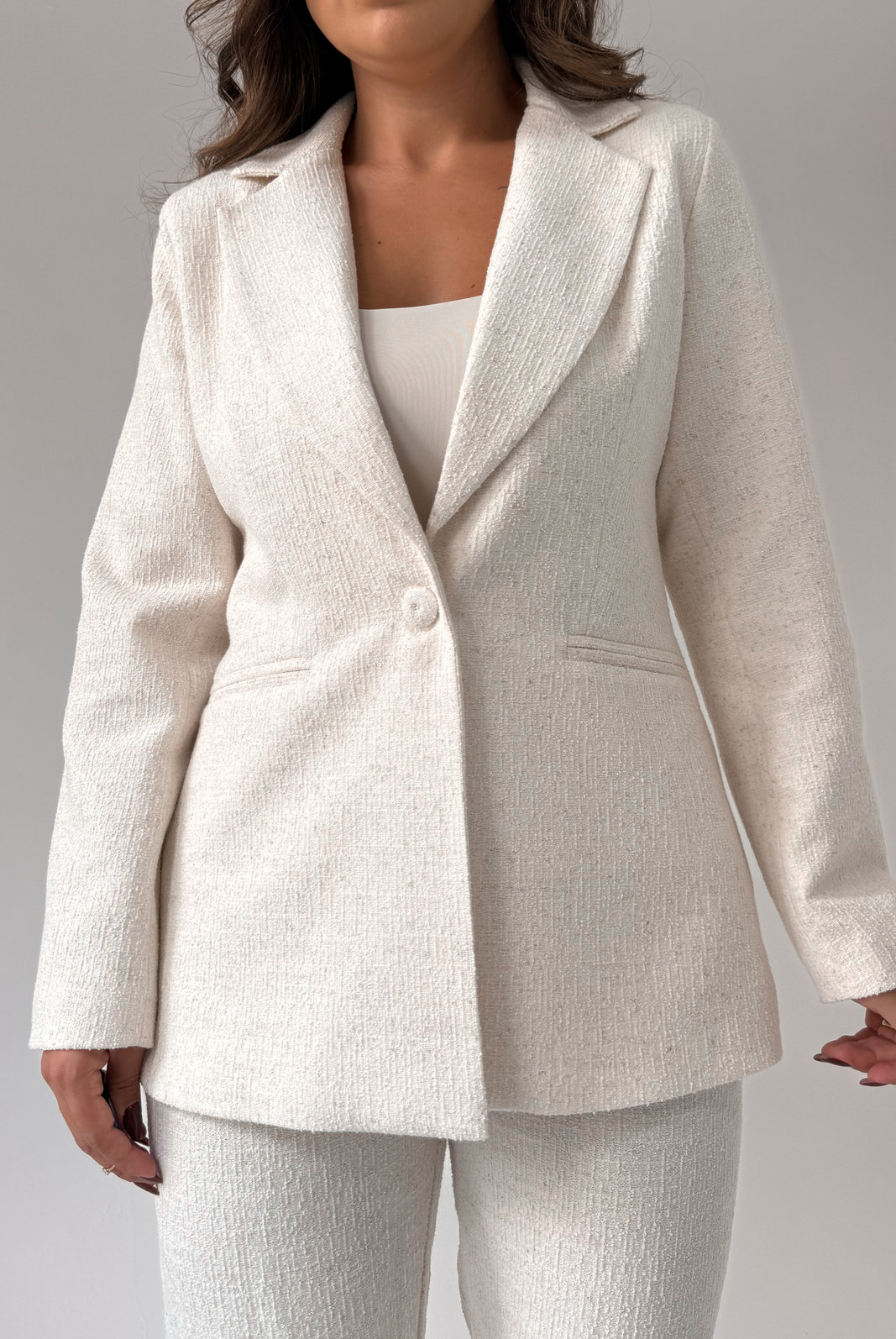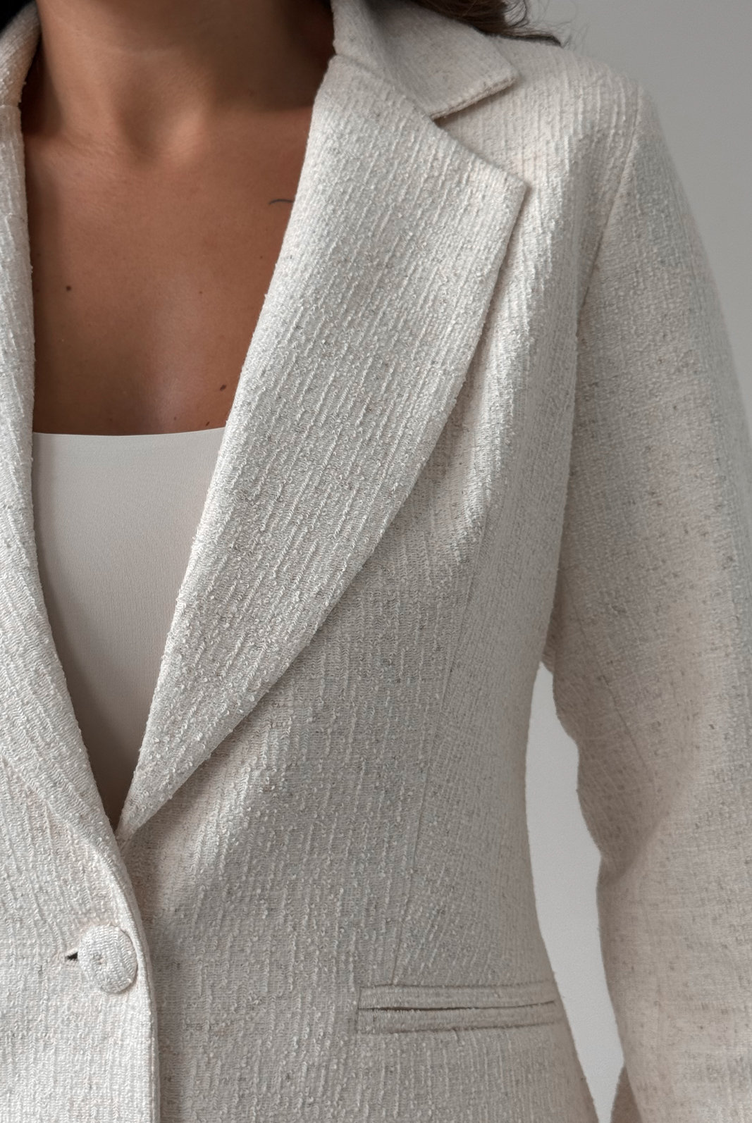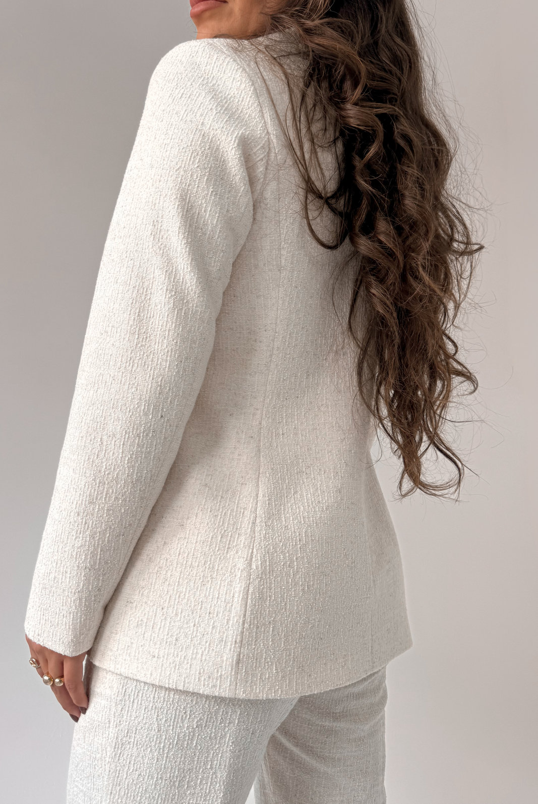 O Blazer Tweed Alice possui gola estruturada, modelagem padrão e fechamento frontal por botão único. Tem costuras nas laterais que simulam bolsos. Possui forro interno em cetim com elastano.