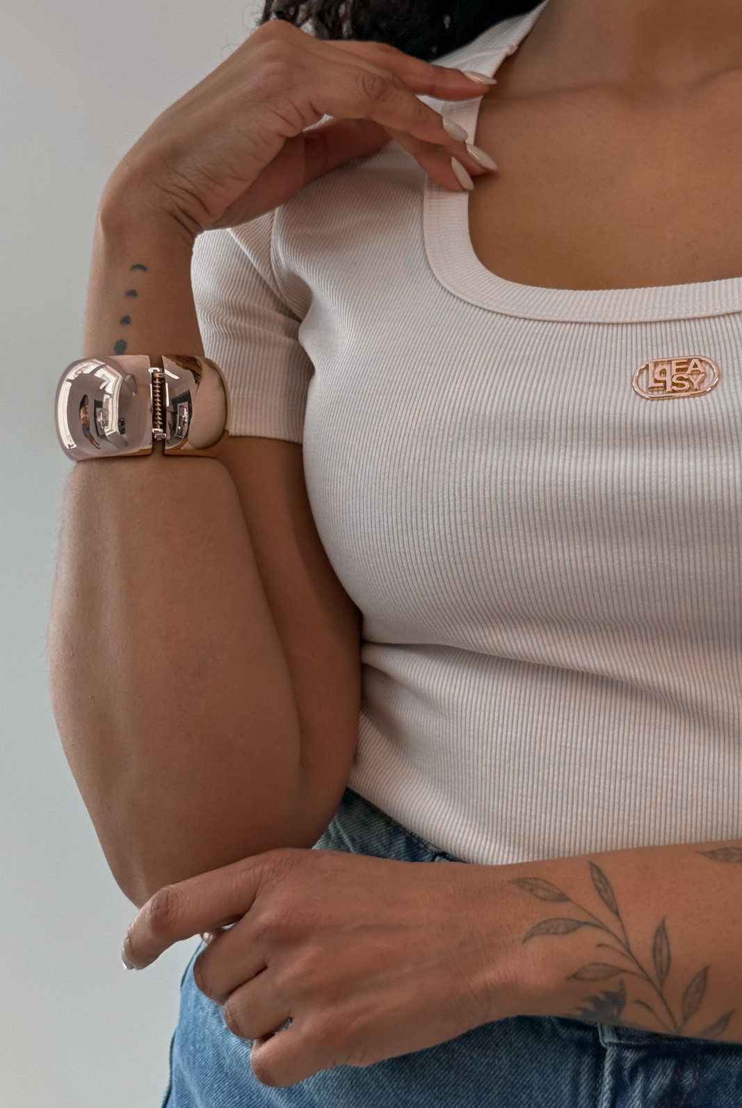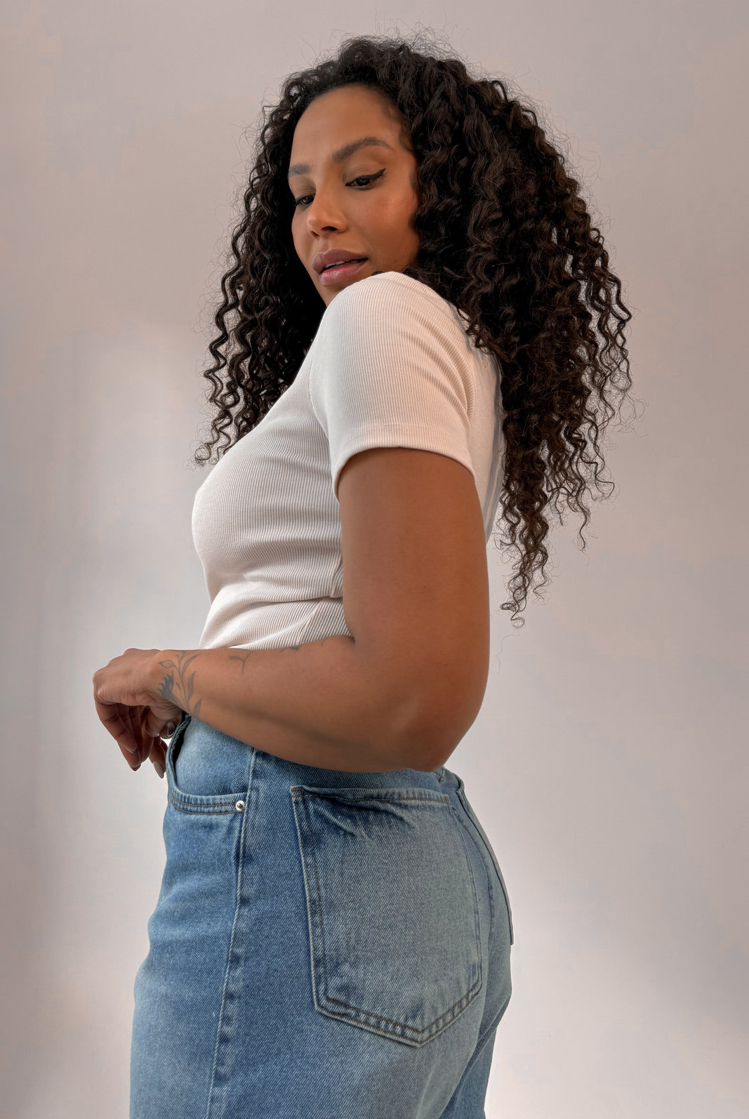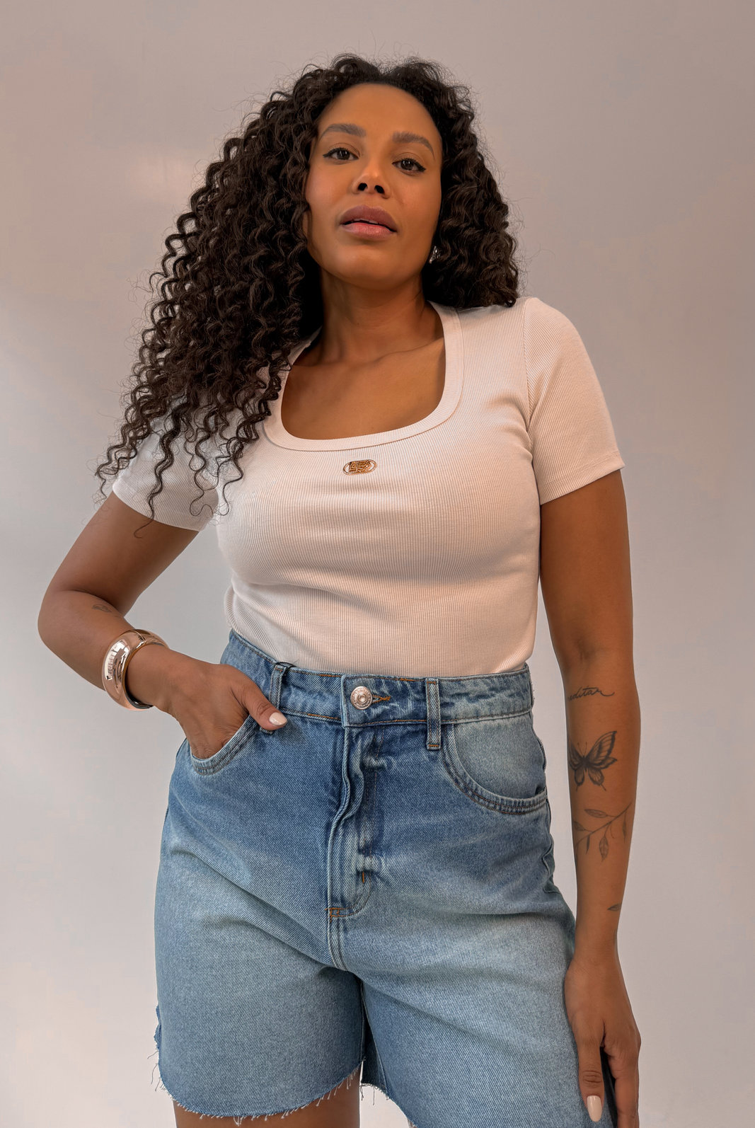 Com gola mais ampla em formato U, traz delicadeza ao visual e valoriza a região do colo! A modelagem justinha ao corpo garante caimento impecável, enquanto as mangas curtas acrescentam frescor e leveza à peça!
