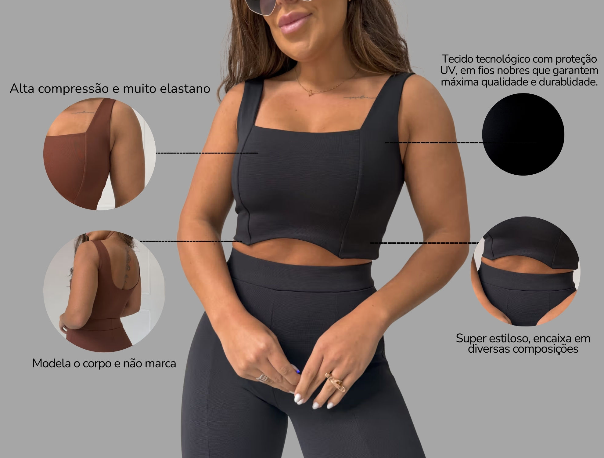 Possui decote em corte reto, tecido duplo que garante sustentação pro seio e alças mais larguinhas para que caso prefira, você possa usar sutiã sem aparecer.