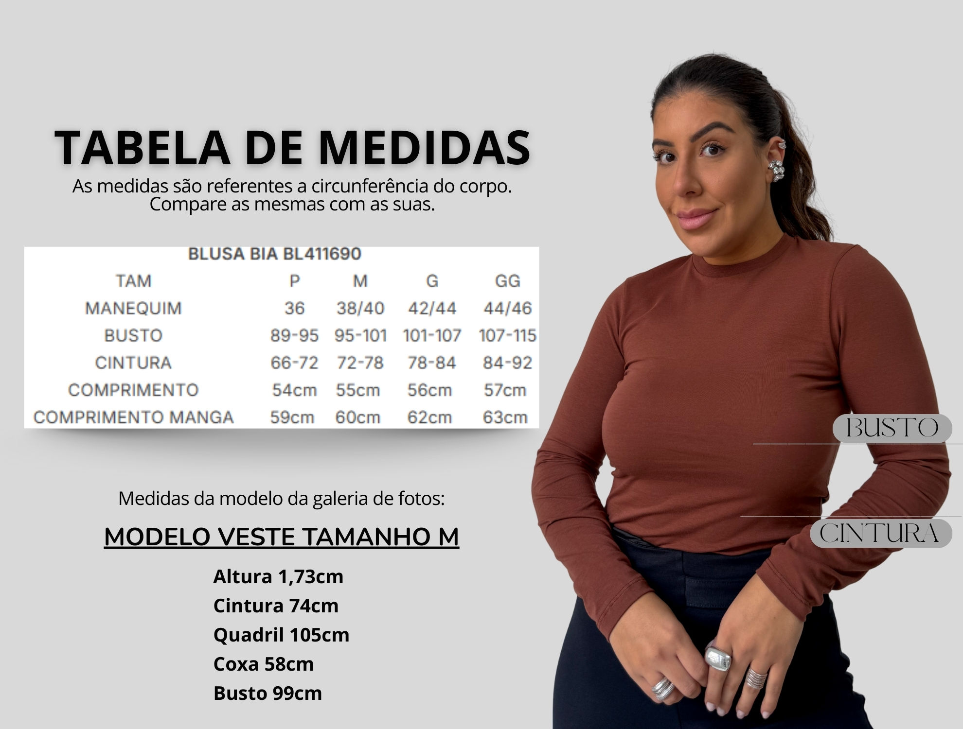 INDICAÇÃO TAMANHO: Forma correta, mas lembre-se de verificar também a tabela de medidas e/ou provador virtual.