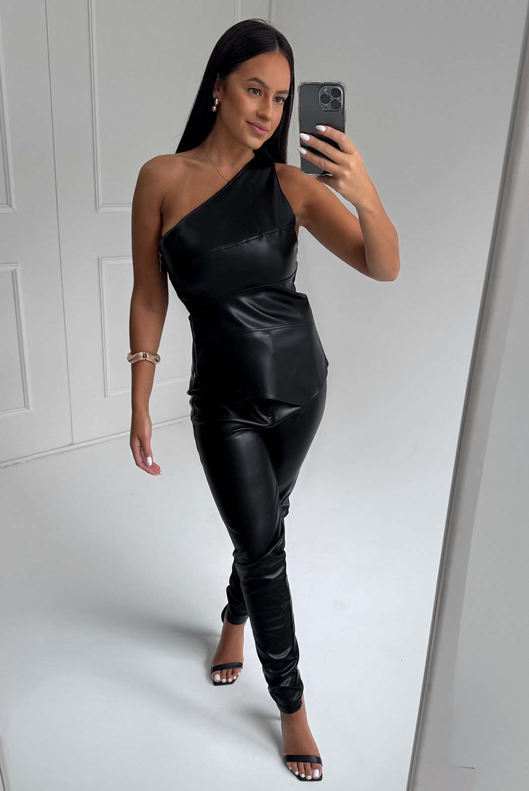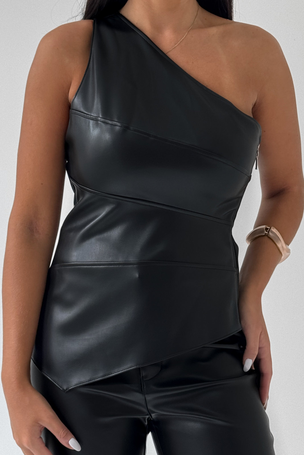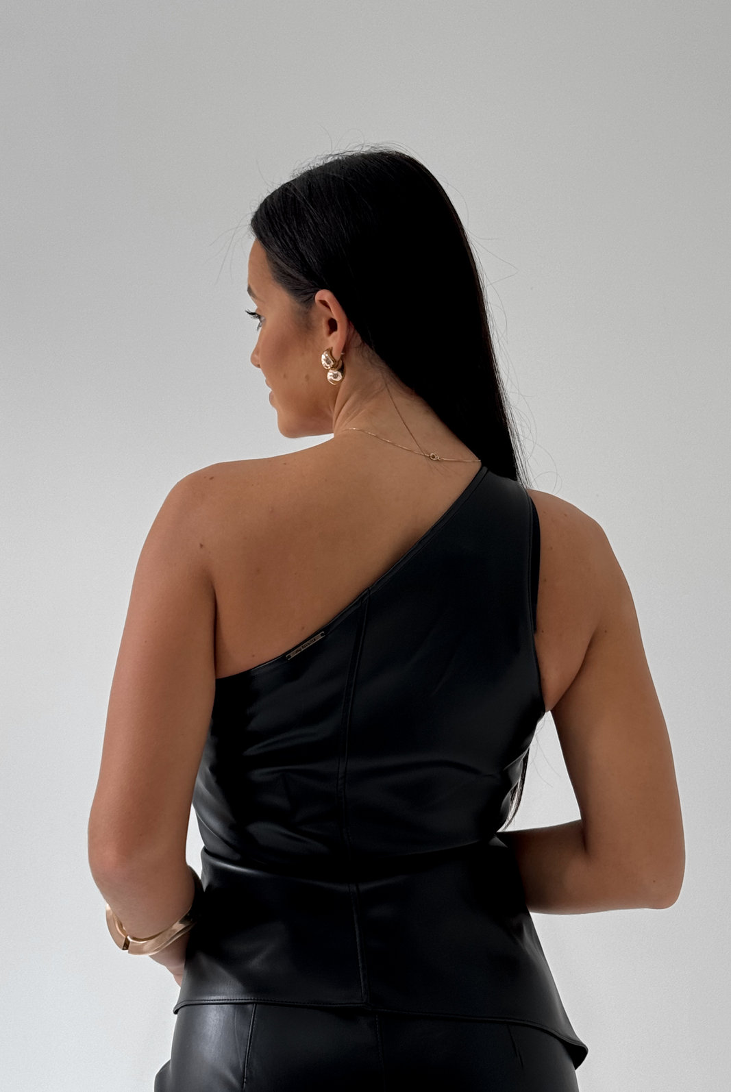 A Blusa Ombro Único Keila MYFT possui costuras estratégicas para valorizar a silhueta e forro interno. O fechamento é por zíper na lateral esquerda, e possui no final do comprimento um corte assimétrico.