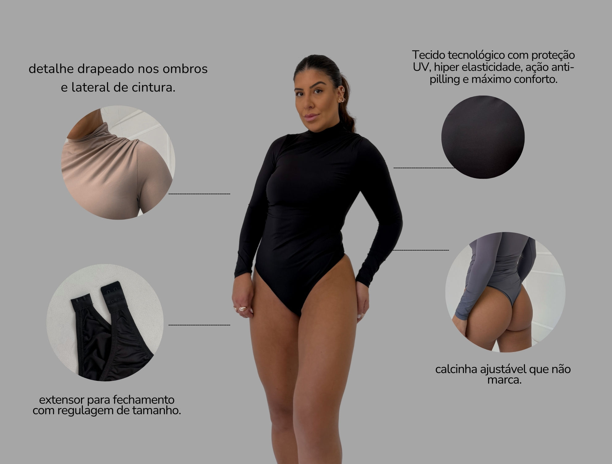 Modelagem ajustada ao corpo, com gola intermediária, detalhes drapeados nos ombros e na lateral da cintura.