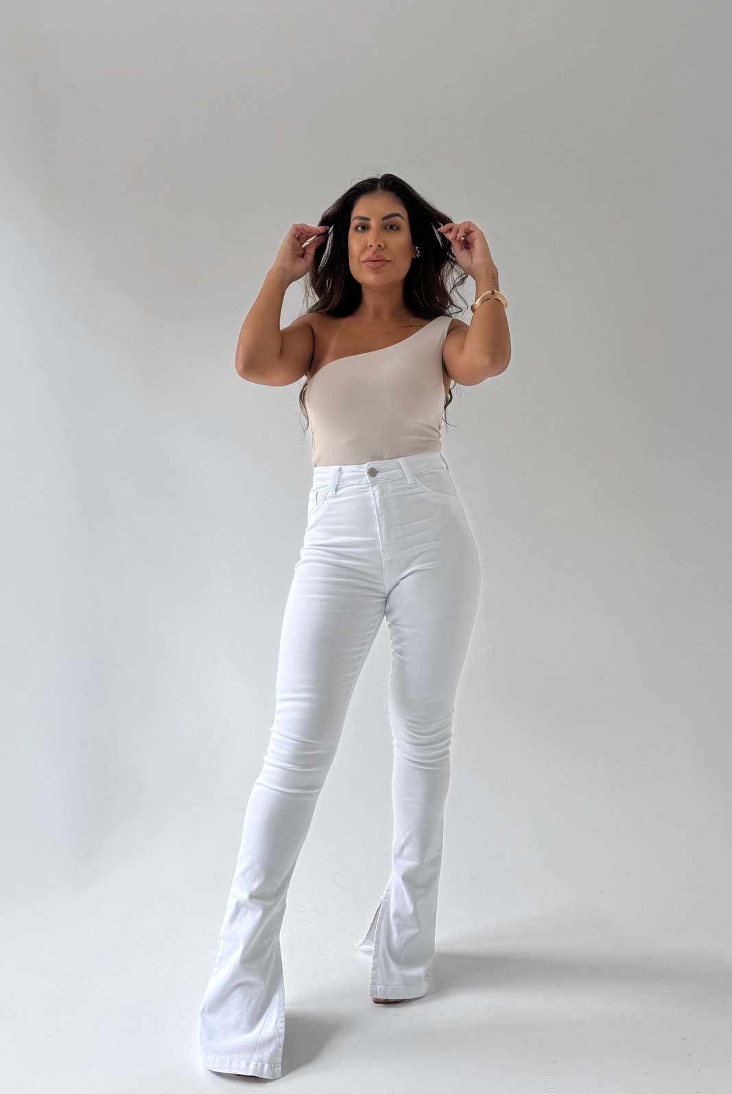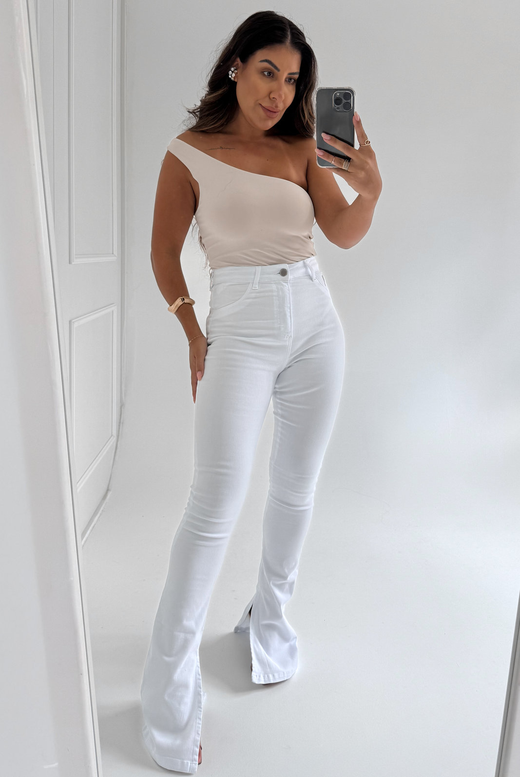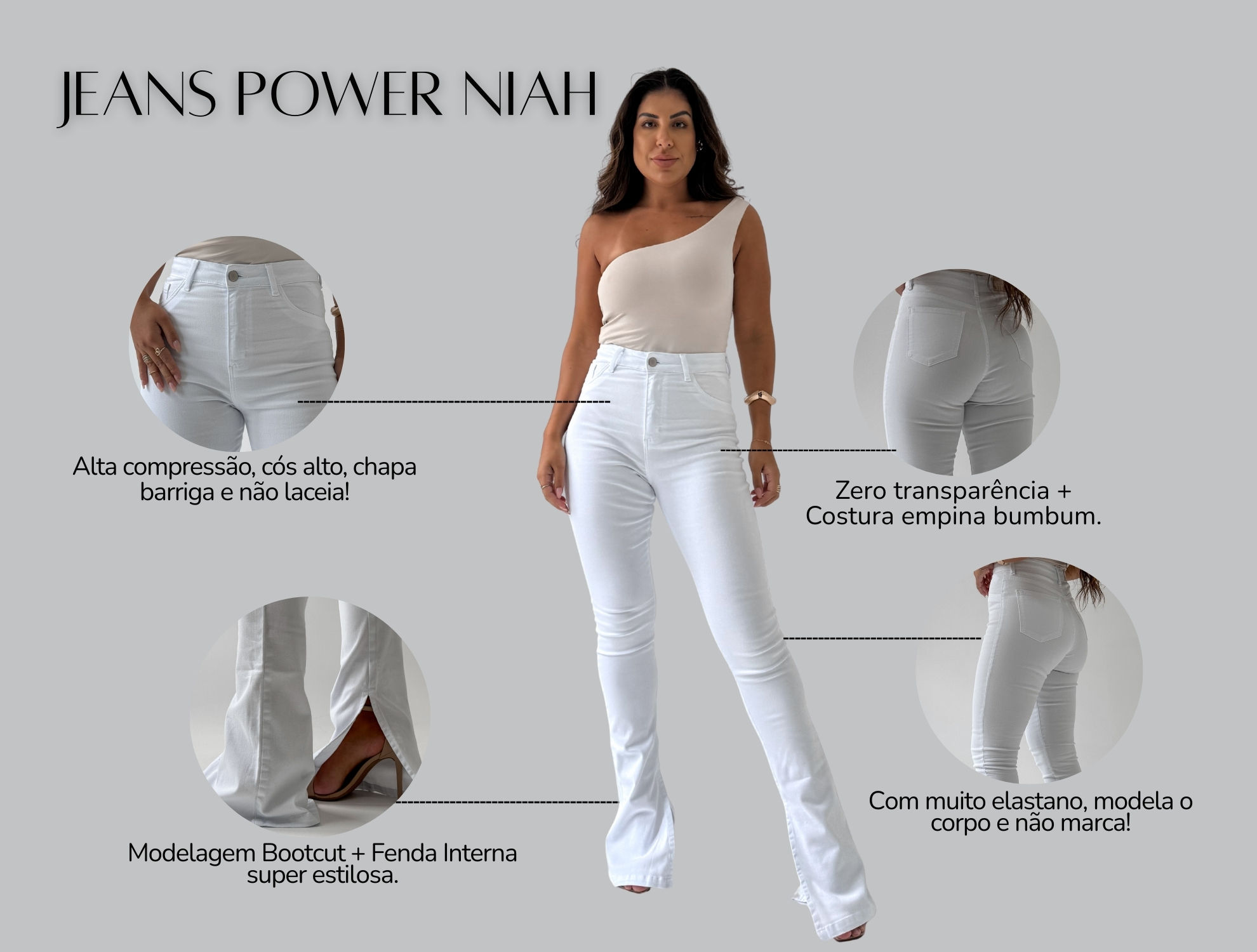 A Calça Jeans Power BootCut Fenda Interna Branca Letícia é o mais novo lançamento da Niah Brand. Com os clássicos benefícios da nossa linha Jeans Power, esse modelo tem muito elastano, alta compressão, cós super alto, costura empina bumbum, não desbota e não laceia!