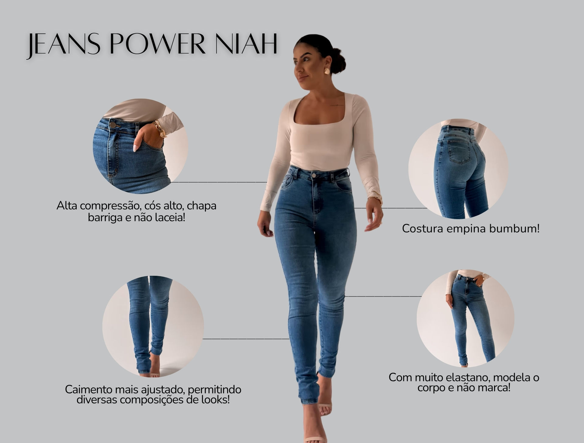 A Calça Jeans Power Clara Skinny Suzi é mais um lançamento da Niah Brand. Com os clássicos benefícios da nossa linha Jeans Power, esse modelo tem muito elastano, alta compressão, cós super alto, costura empina bumbum, não desbota e não laceia!
