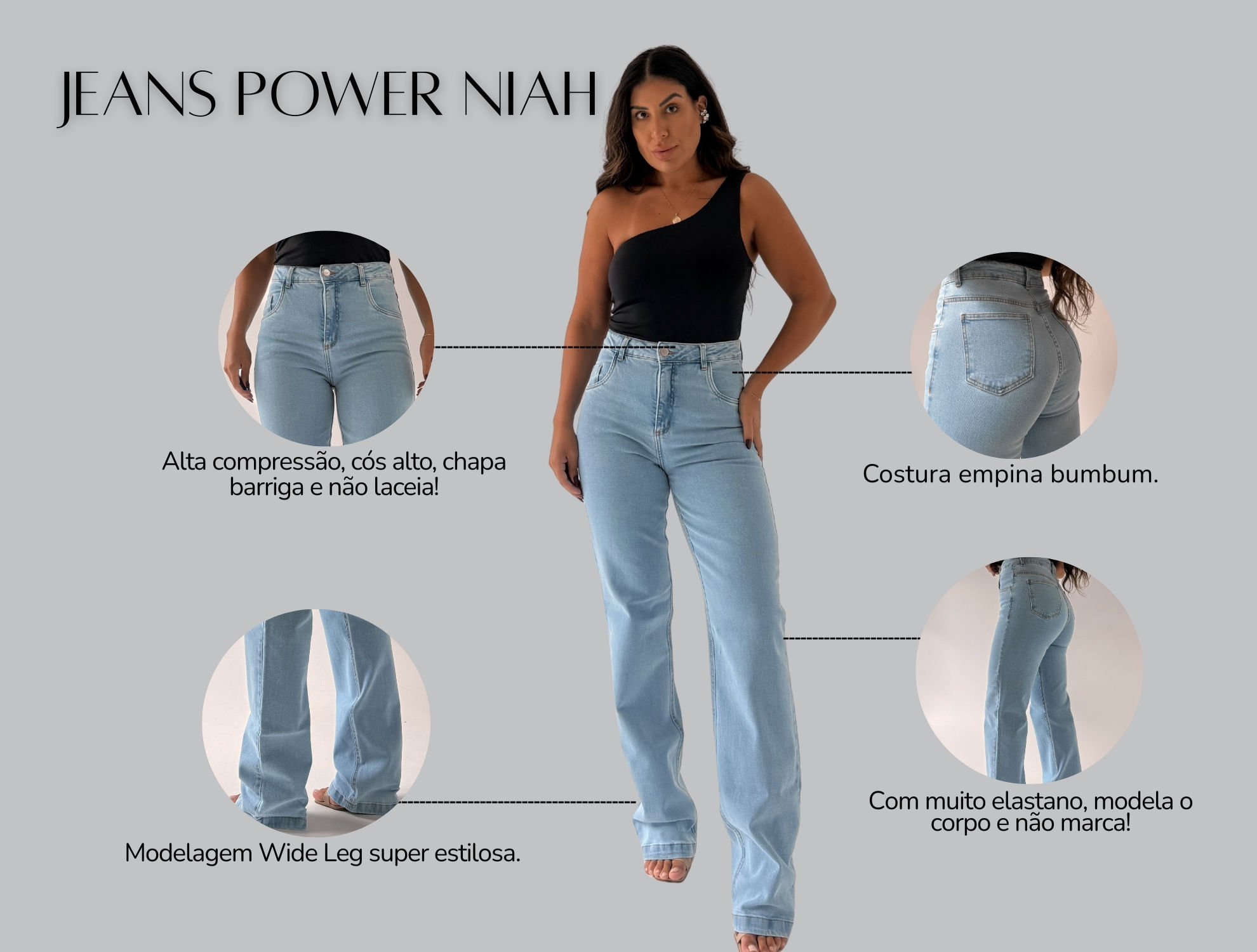 A Calça Jeans Power Wide Leg Laís é mais um lançamento da Niah Brand. Com os clássicos benefícios da nossa linha Jeans Power, esse modelo tem muito elastano, alta compressão, cós super alto, costura empina bumbum, não desbota e não laceia!