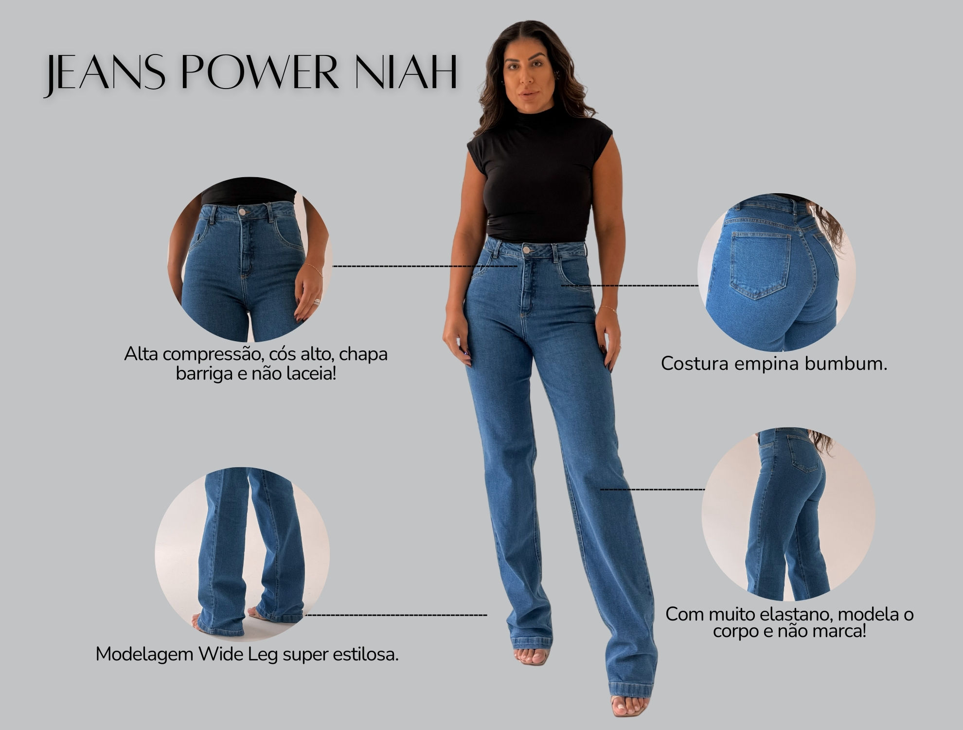 A Calça Jeans Power Wide Leg Stacy é mais um lançamento da Niah Brand. Com os clássicos benefícios da nossa linha Jeans Power, esse modelo tem muito elastano, alta compressão, cós super alto, costura empina bumbum, não desbota e não laceia!