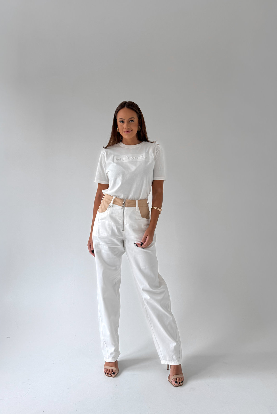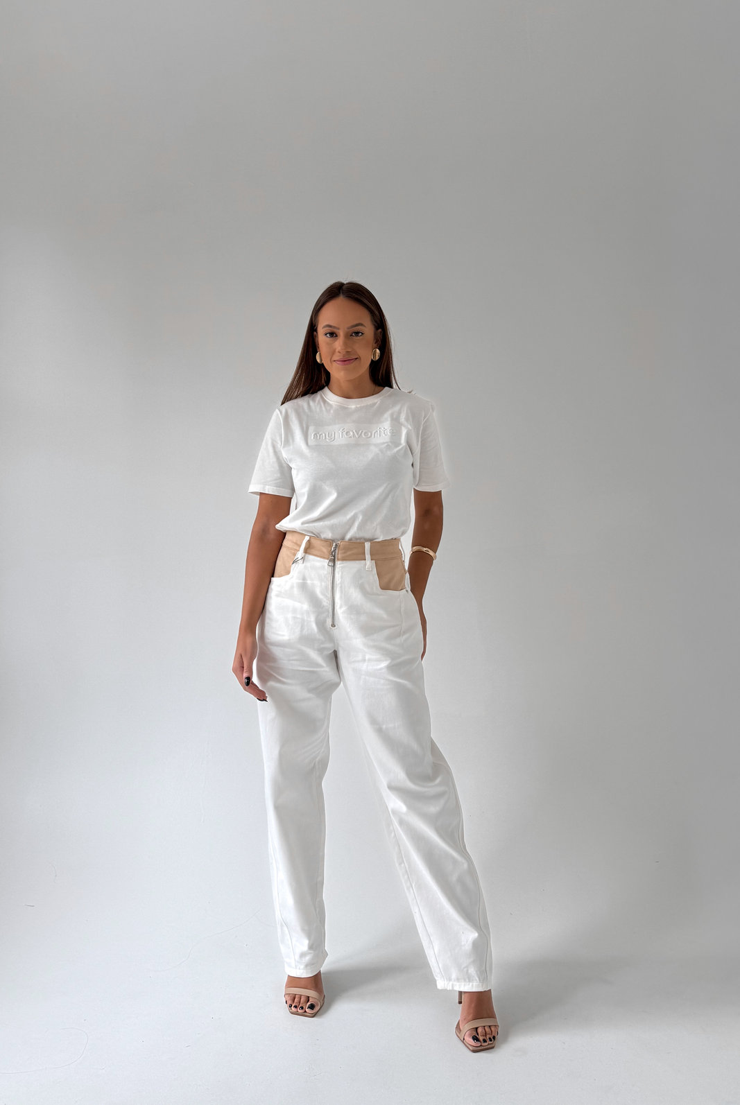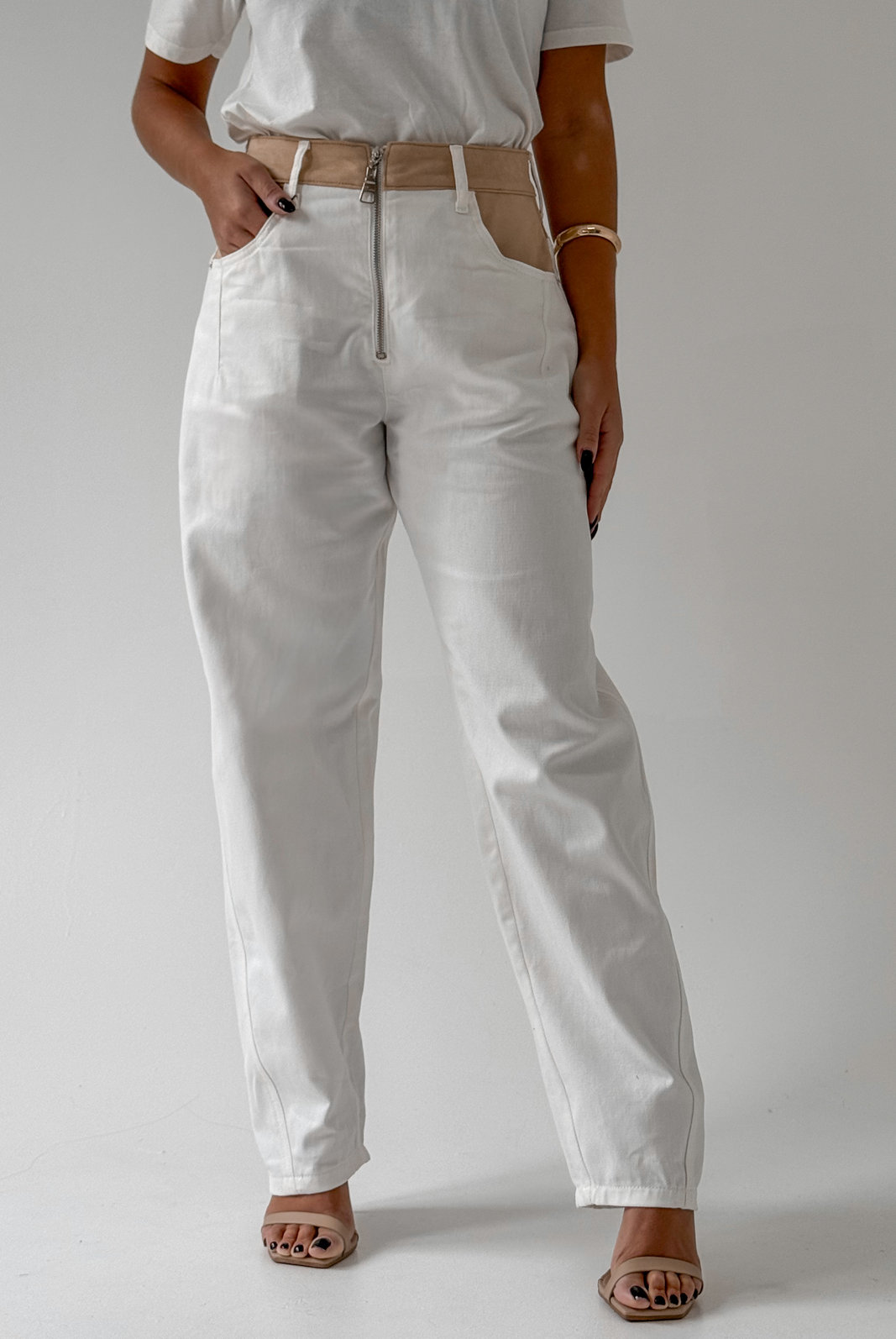 A Calça Sarja Barrel Lesly MYFT possui bolsos frontais e traseiros. Com fechamento frontal por zíper, o principal detalhe desse modelo é o recorte em sarja bege na parte do cós da calça. Modelagem soltinha no corpo, possui também passantes pra cinto e leve (bem pouco!) transparência.