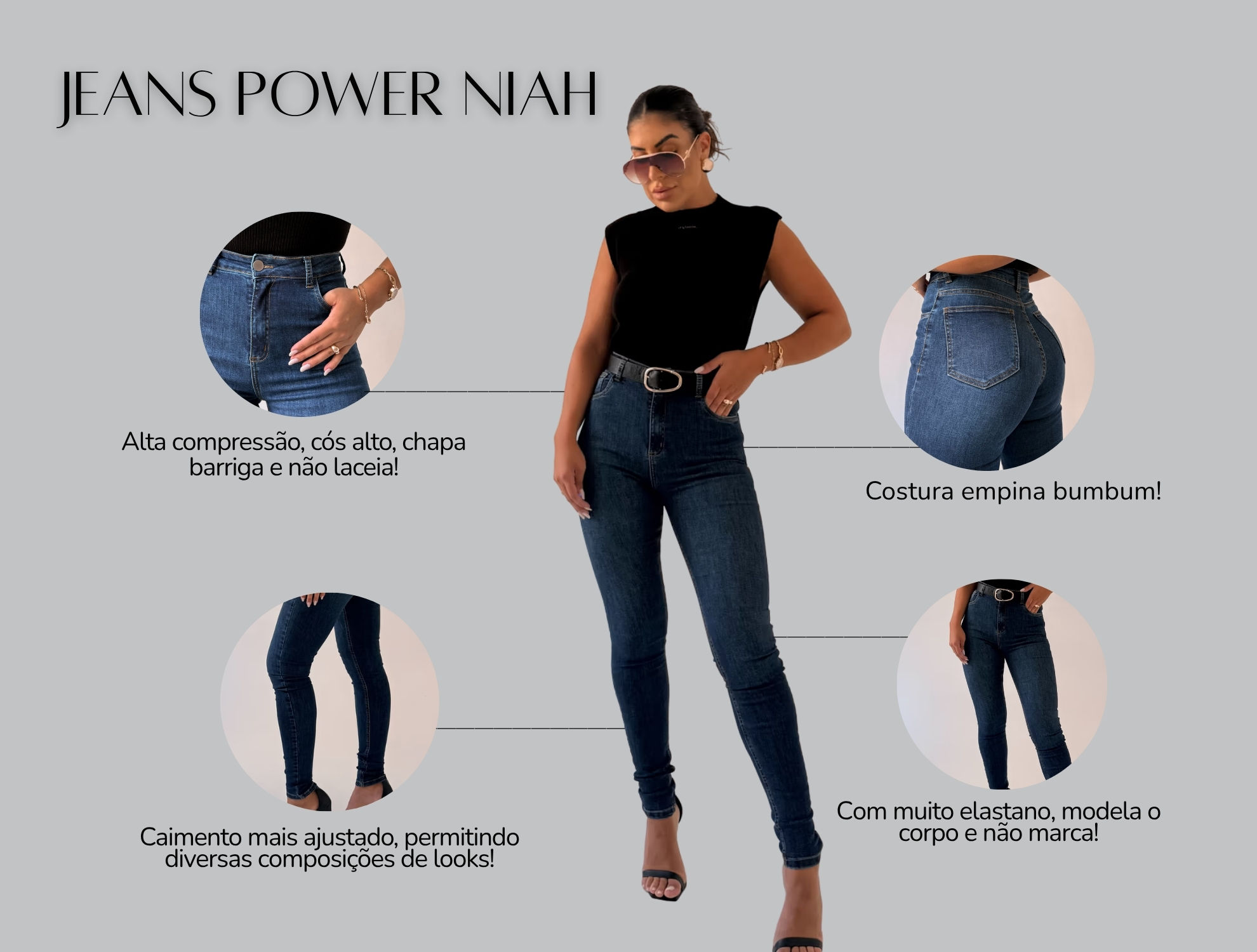 A Calça Jeans Power Skinny Suelen é mais um lançamento da Niah Brand. Com os clássicos benefícios da nossa linha Jeans Power, esse modelo tem muito elastano, alta compressão, cós super alto, costura empina bumbum, não desbota e não laceia!