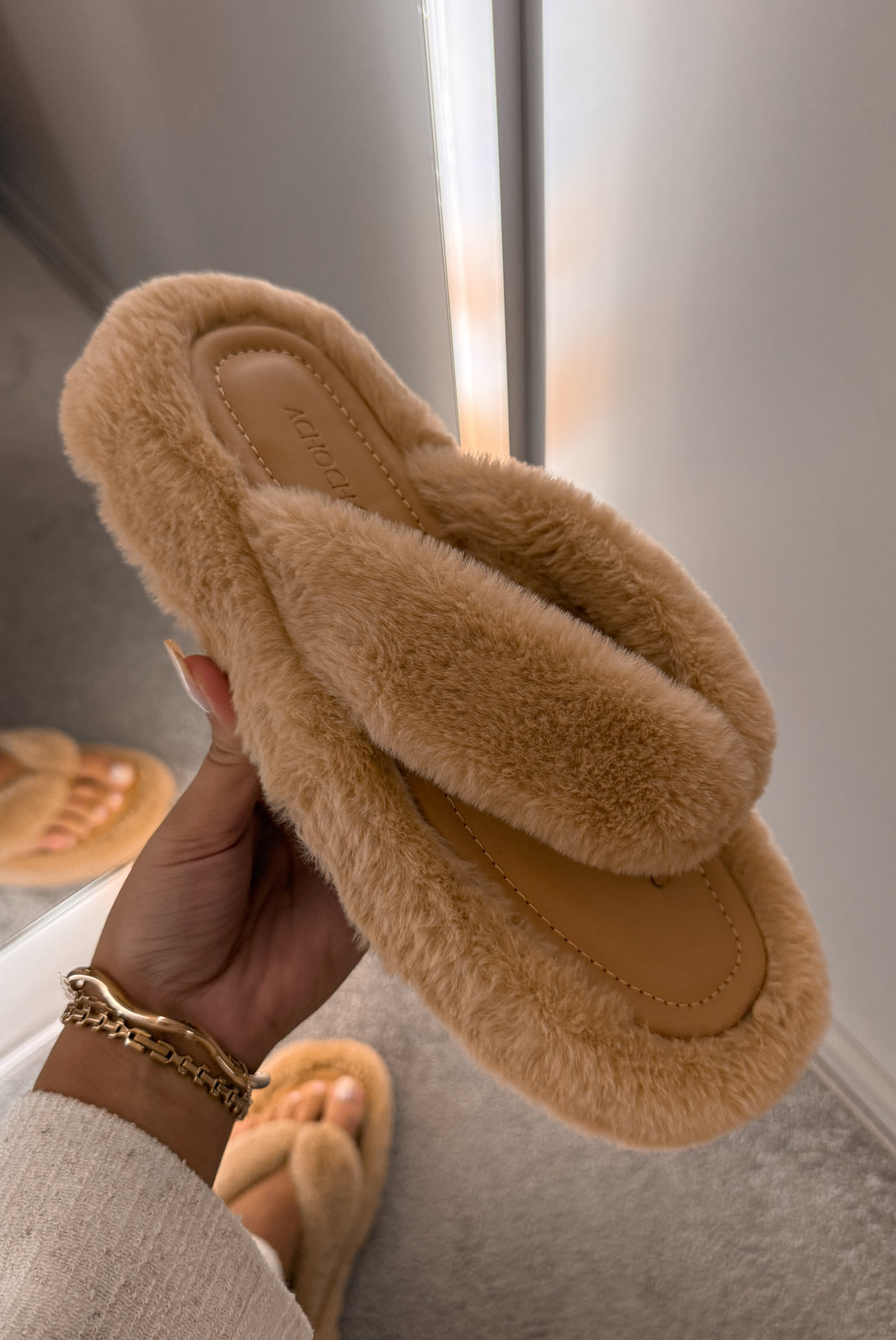 A base do calçado possui acolchoado macio, garantindo conforto ao caminhar. Na parte interna das tiras também é peluciada, assim como ao redor da superfície da Flat, e é super macia e quentinha. A sola é tratorada.
