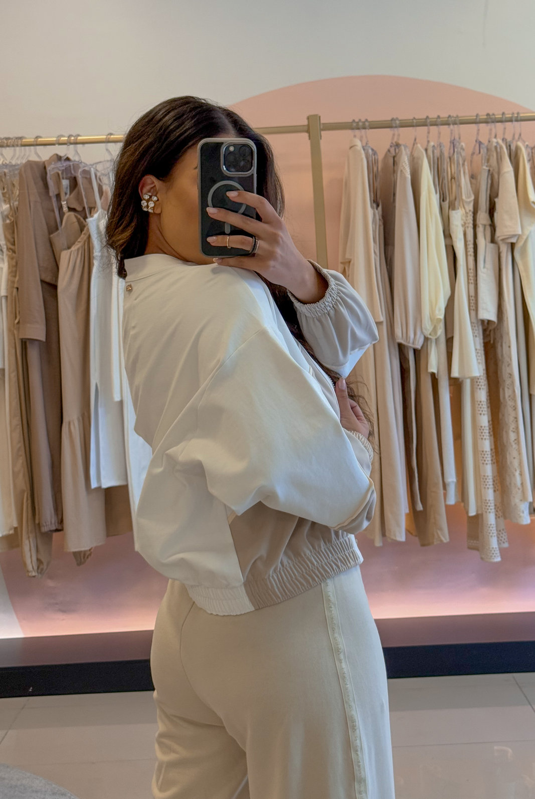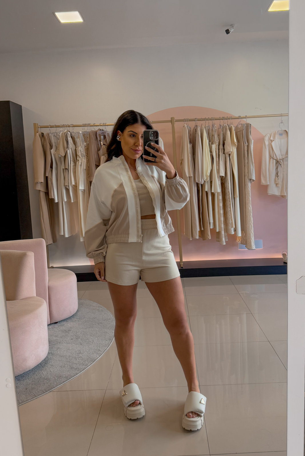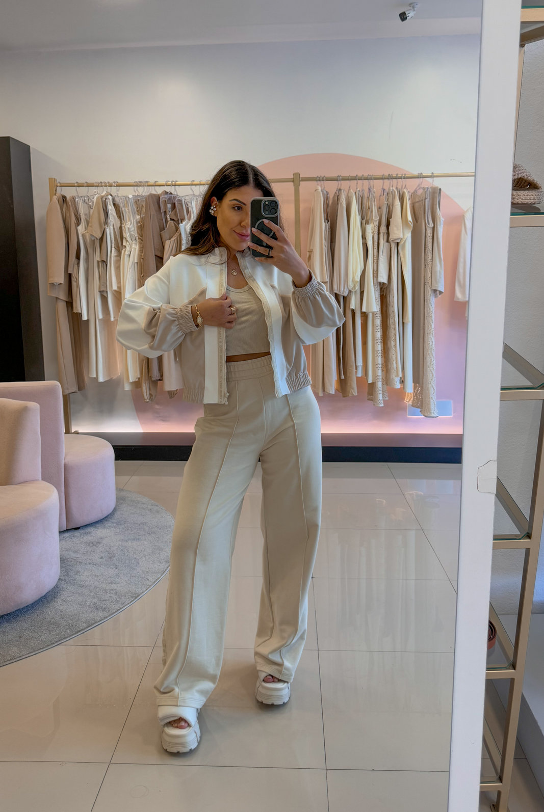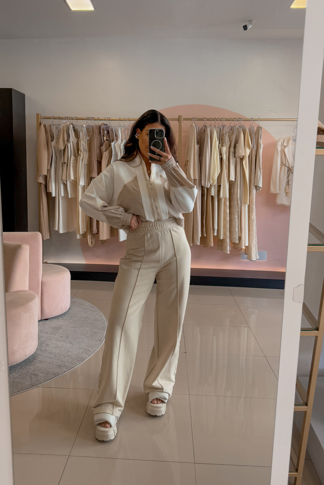 Os punhos e barra com elástico dão caimento perfeito, enquanto o mix de cores neutras deixa a peça ainda mais versátil e atemporal — ideal para combinações práticas, estilosas e cheias de personalidade.