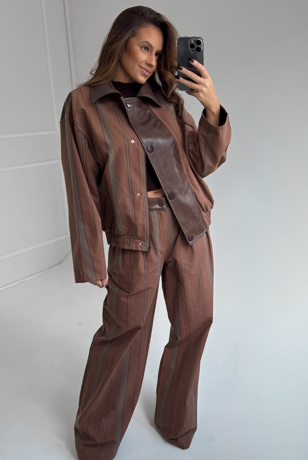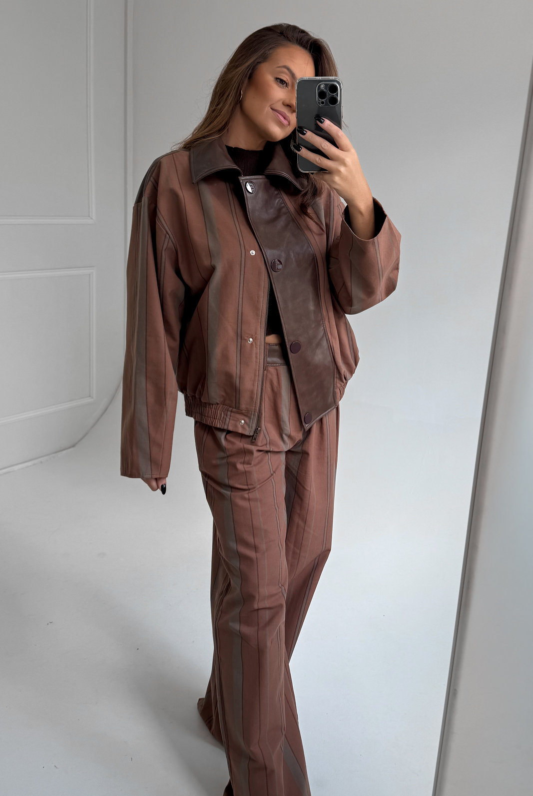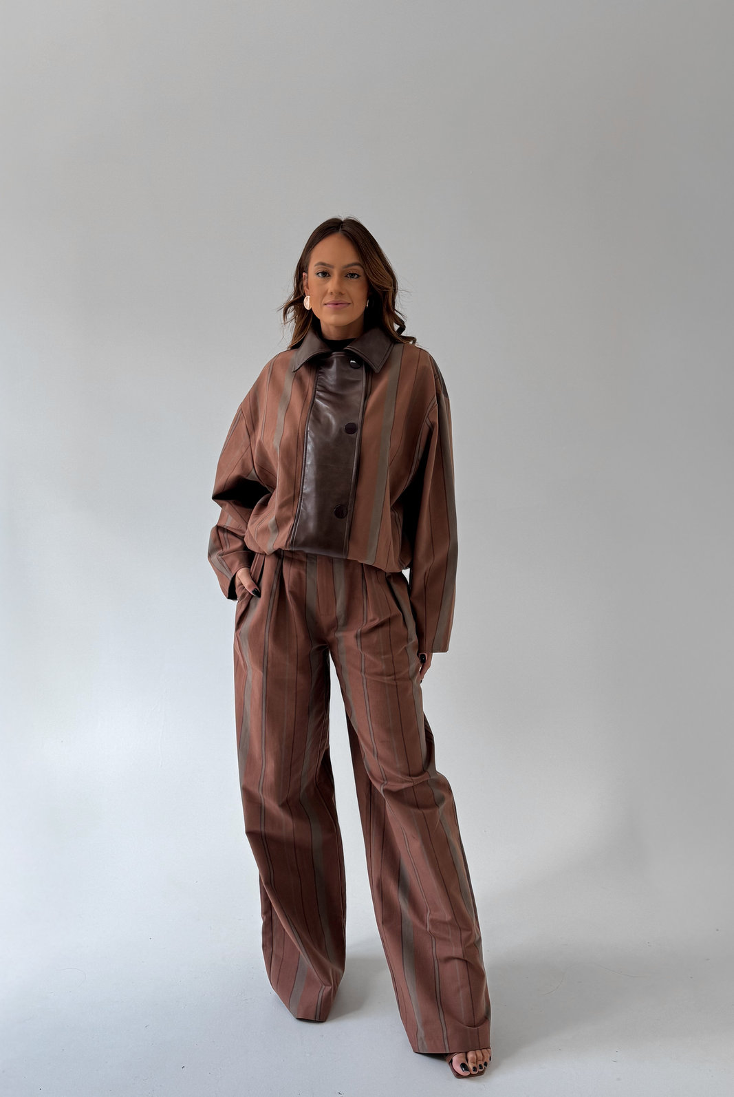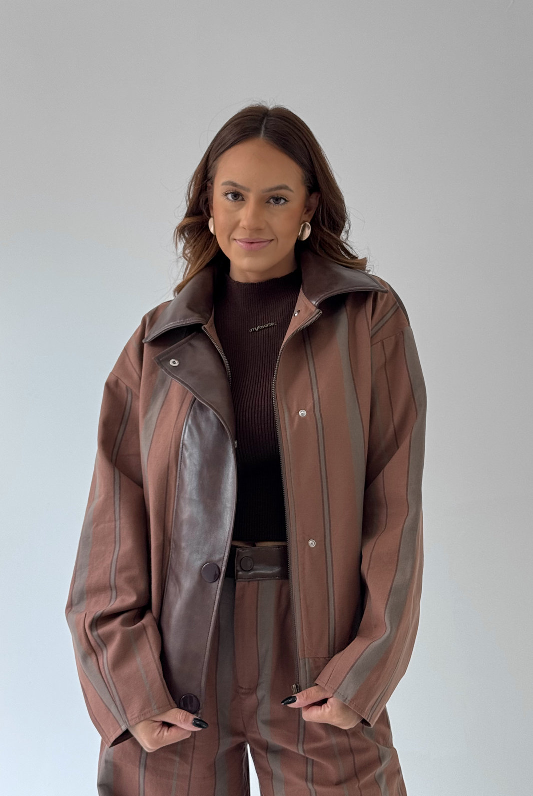 A Jaqueta Bomber Lizi MYFT possui fechamento por zíper e botão de pressão na parte frontal. Com gola estruturada e elástico na cintura, possui partes em couro PU e estampa listrada. Extremamente estilosa, mais oversized com modelagem bomber.
