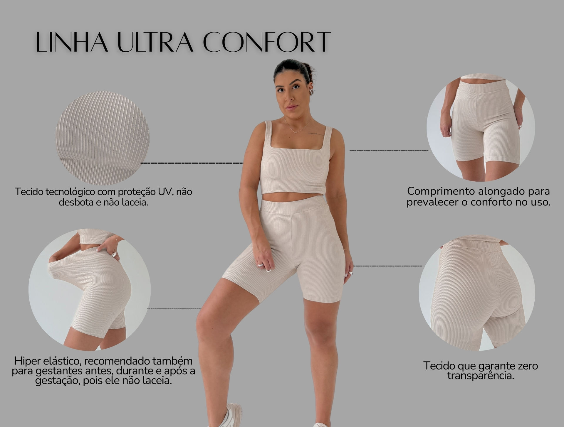 Produzida em tecido tecnológico com trama canelada que tem como benefícios: