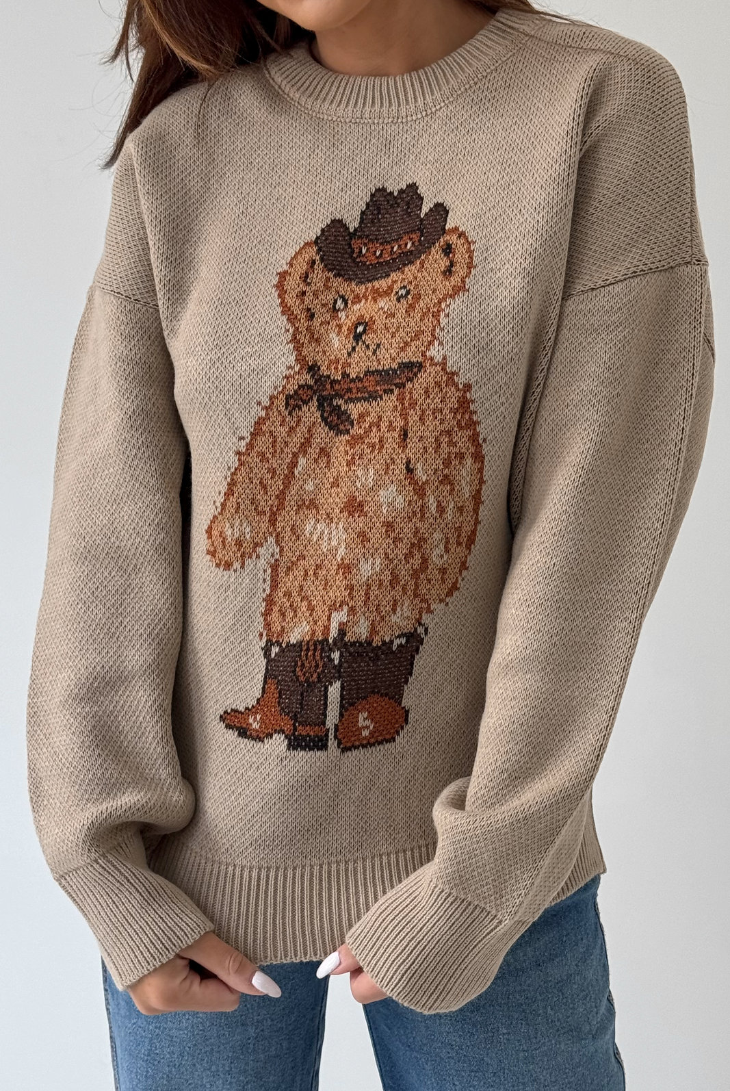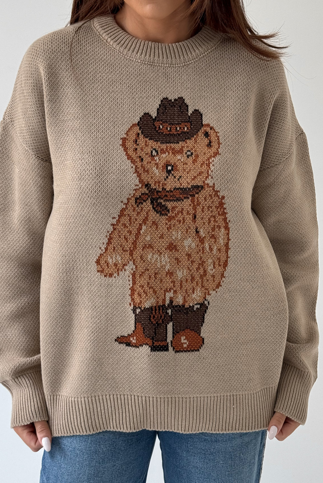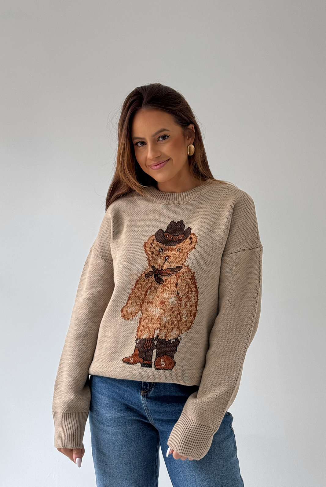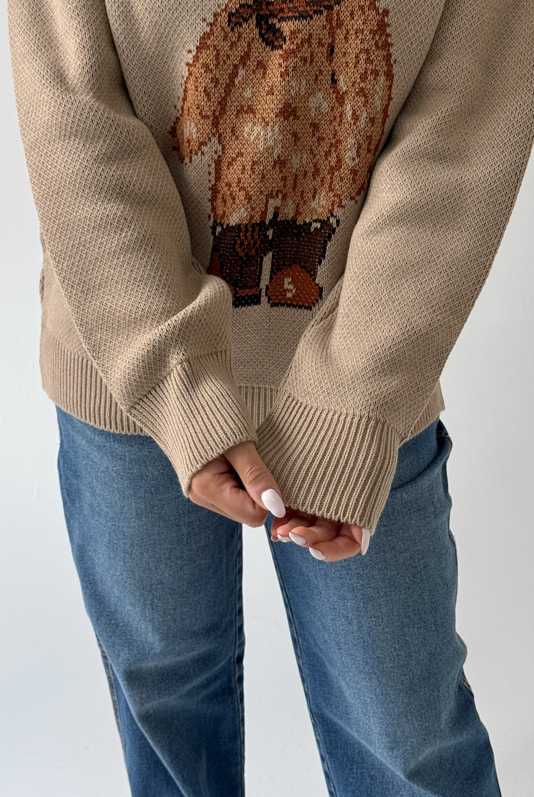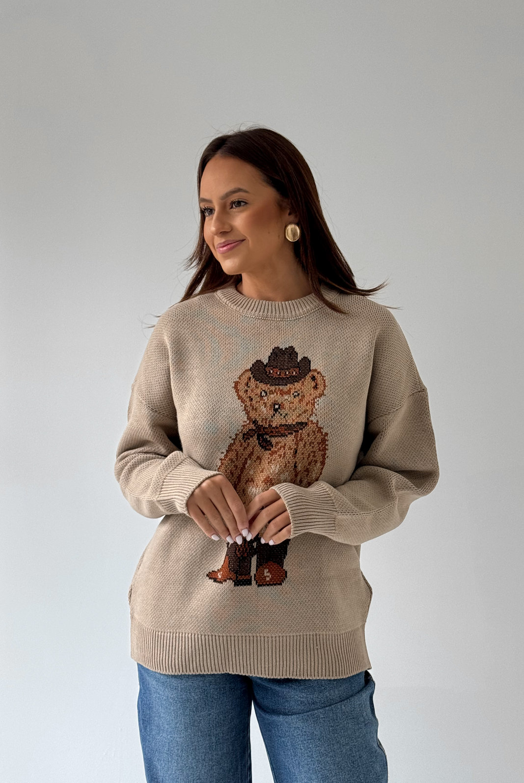 O Sueter Nicole MYFT possui gola, punhos e barra em malha canelada. Com modelagem mais soltinha no corpo, o destaque fica por conta do ursinho centralizado na frente da peça.