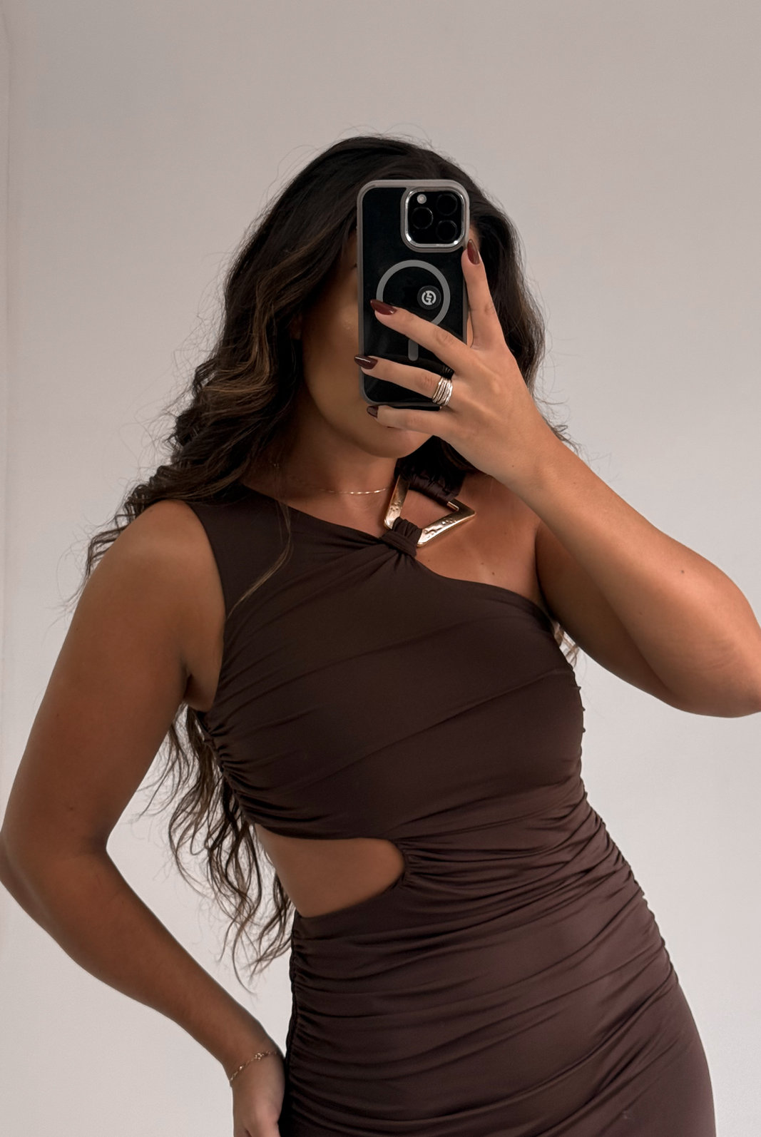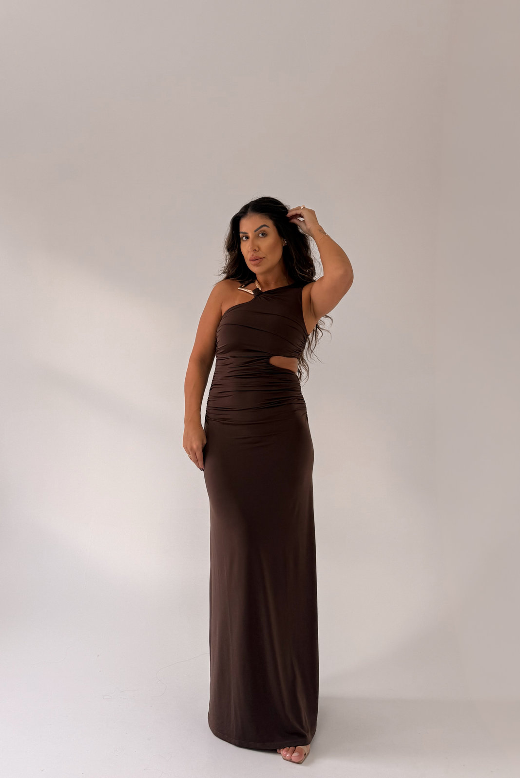 O Vestido Longo Scarlet MYFT é de ombro único e possui uma aplicação dourada próxima ao pescoço, também possui recorte na cintura e forro interno. Com modelagem ajustada ao corpo, ele valoriza a silhueta de forma elegante.